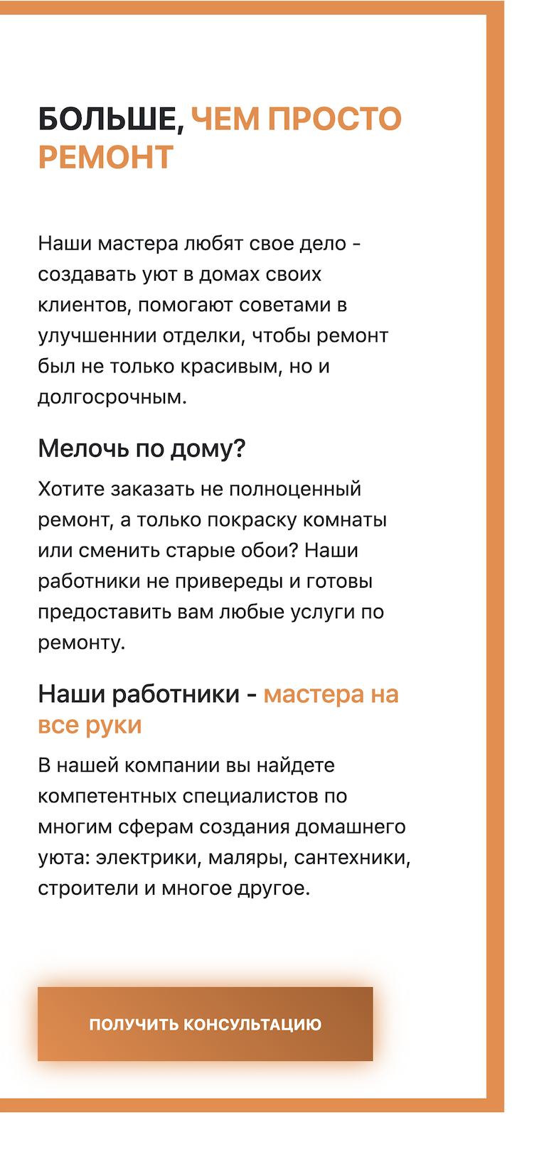 To create a website for a company offering small repair services. The website should: present the company, its mission, experience, and specializations to build trust with potential clients, clearly and thoroughly display the services offered, such as electrical repairs, plumbing, furniture assembly, and minor renovation work, highlight the quality and reliability of the services provided by including information about guarantees and terms of cooperation, ensure that the design is clear, intuitive, and provides easy access to all the information, with the option for quick contact with the company, add a feature for quickly sending inquiries along with contact details, enabling users to easily book a service, ensure the site is responsive and optimized for SEO to reach local clients.